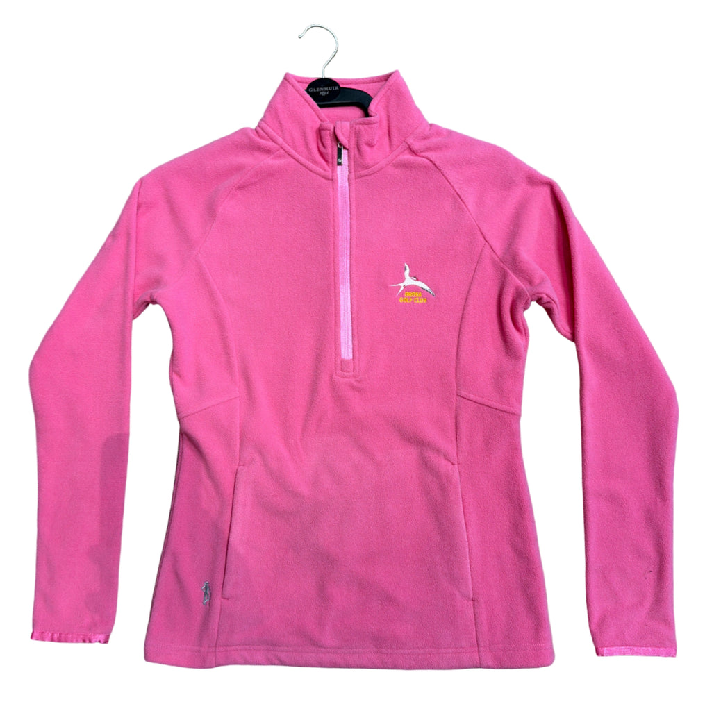 The g.Joni ladies’ quarter zip fleece golf midlayer is both functional and stylish, crafted from a super soft performance fabric. Featuring flattering shaped seam detailing and satin stretch binding at the cuffs, this midlayer ensures a comfortable fit. The satin zip with a silver diamante puller adds a touch of elegance, while two zipped side pockets offer practicality. Finished with silver lurex Glenmuir Lady embroidery above the right hem, this midlayer is perfect for layering on cooler days on the course.