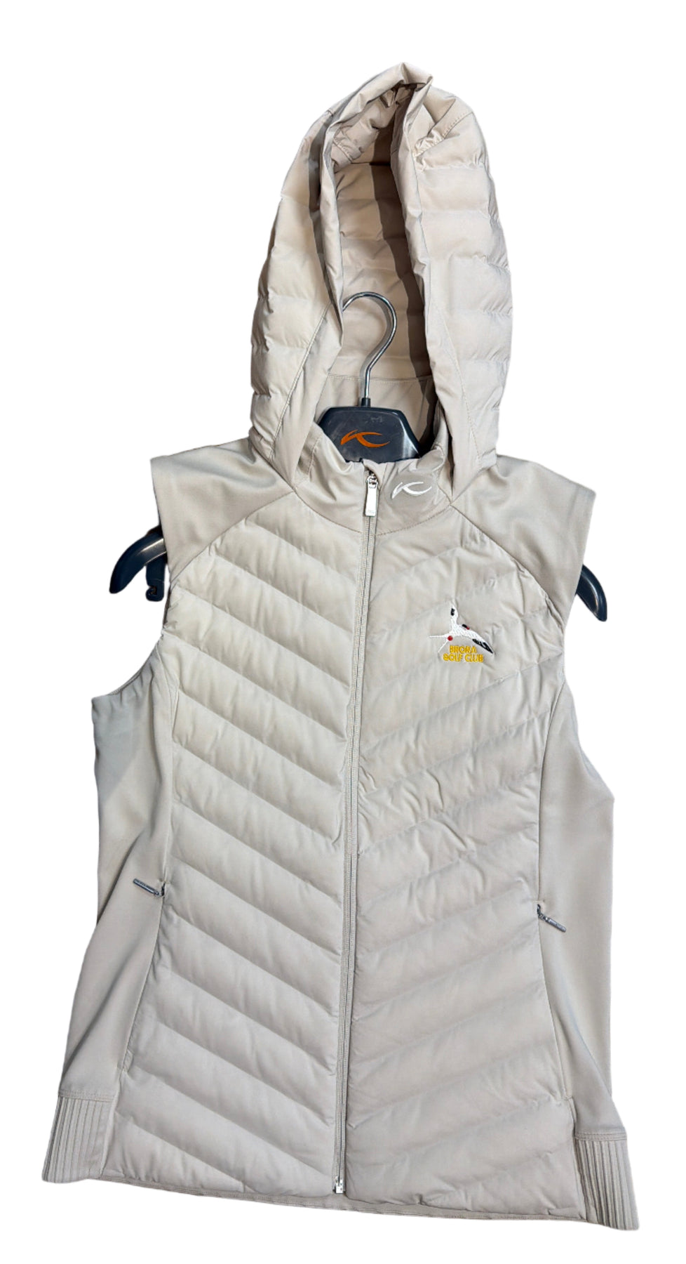 A modern style, this hooded gilet features woven chambers, bonded rib sleeve cuffs, and a bottom band for added elegance. Soft, water-repellent fabric and an insulated front provide added warmth, while the spacious back pocket conveniently secures your essentials. Perfect for cool to cold days.