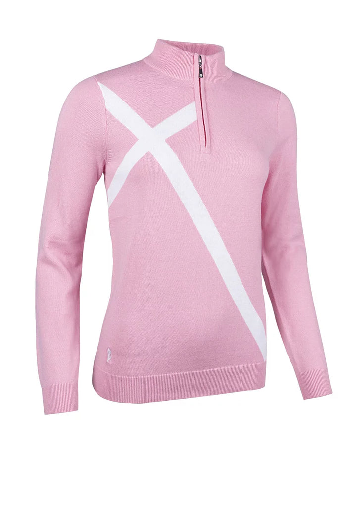 Patriotically styled our g.Ladies Saltire golf sweater hints at the long heritage and deep ties between Scotland and golf (and indeed, that of Glenmuir too) … and of course, it looks rather lovely as well, with its candy pink background and geometric design. Our adjustable quarter zip sweater is soft, light, and fine gauge, fully fashioned in pure, natural 100% combed cotton, making it comfortable, breathable and immensely practical too for year-round use. The design includes a pretty diamante detail zip puller and lady golfer embroidery set above the hip at the right hem.